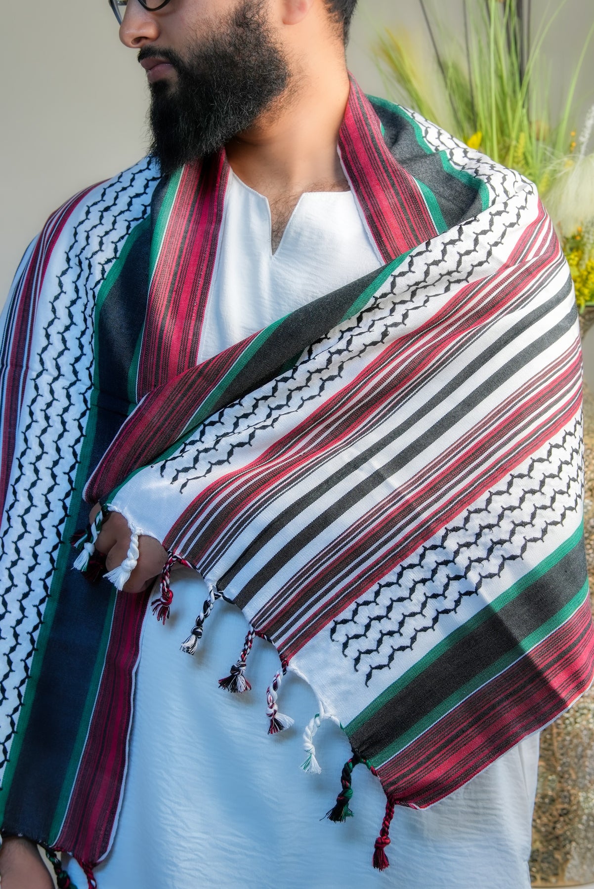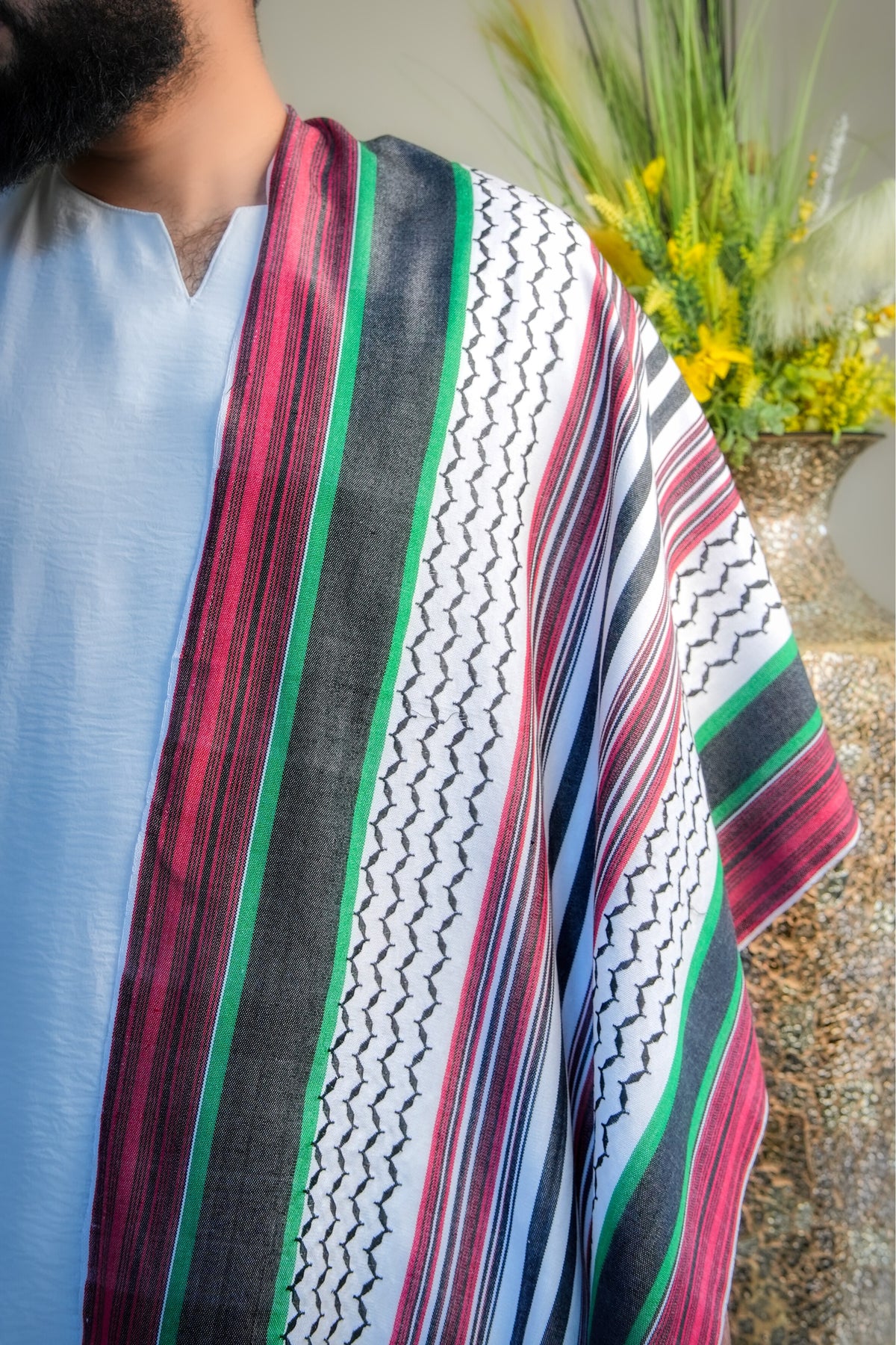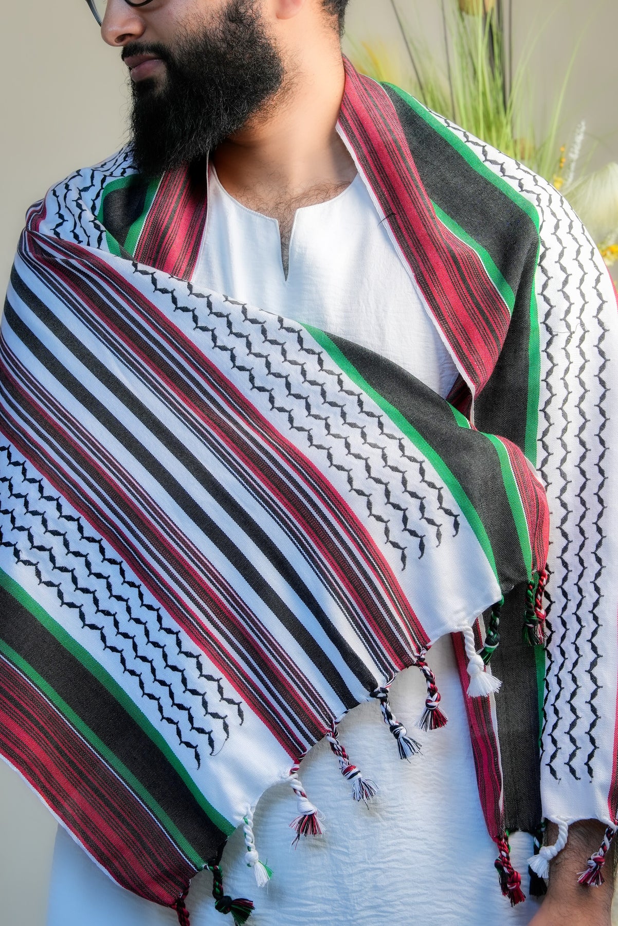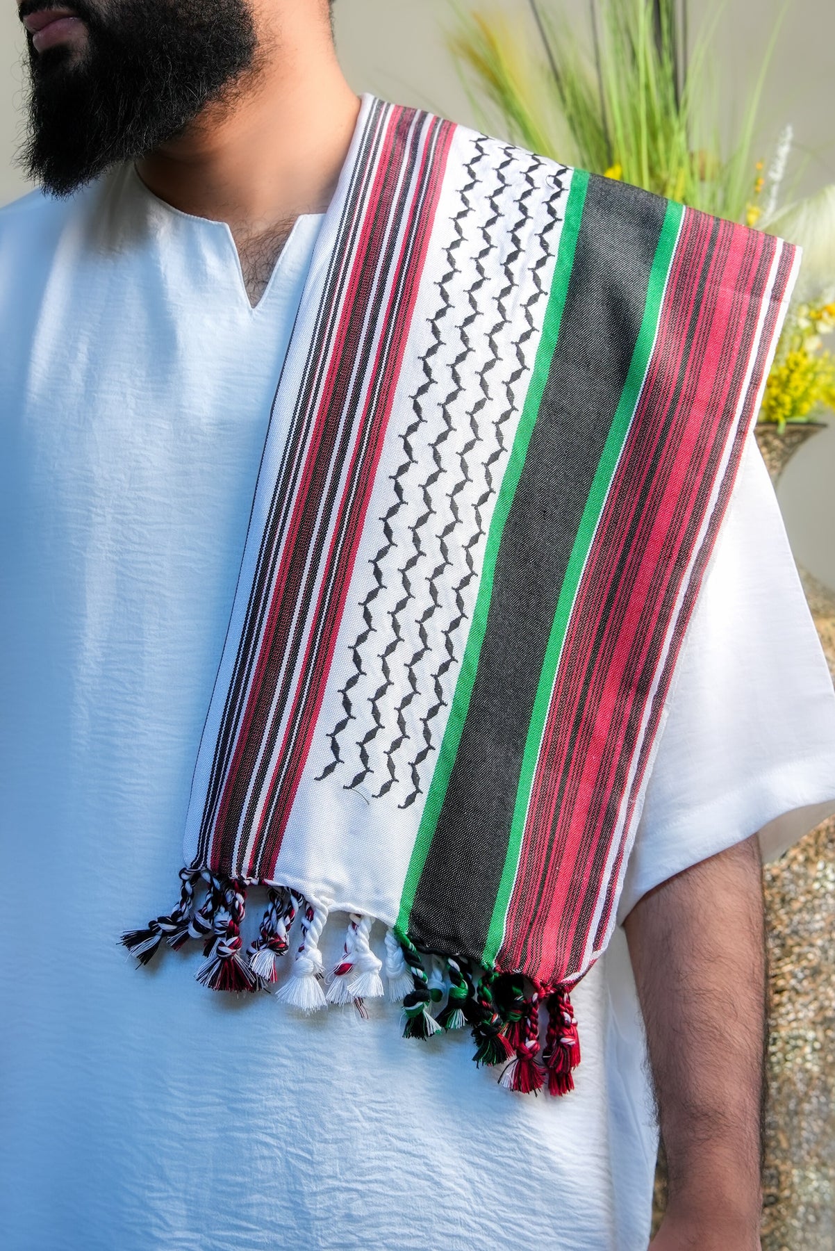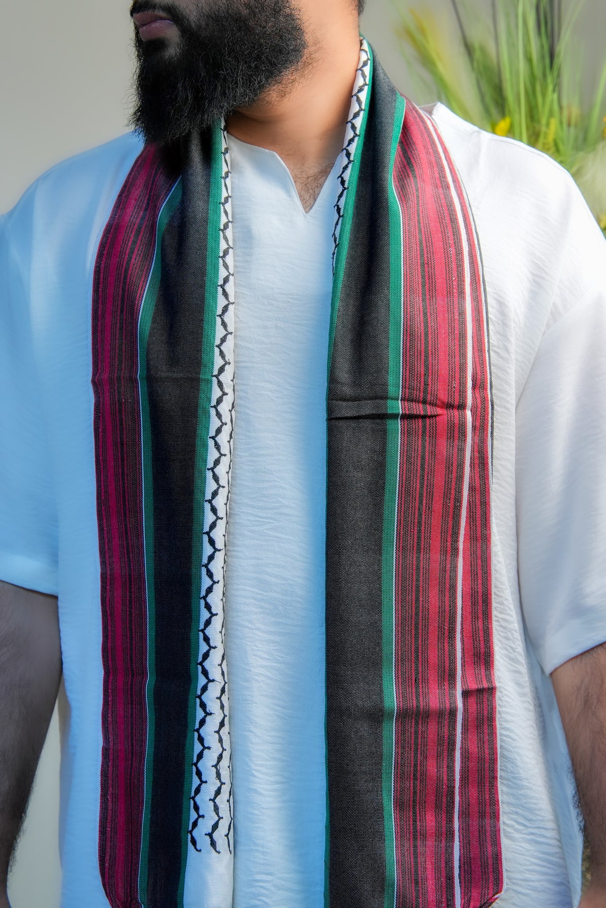 Woven in the heart of Yemen, this handmade scarf is part of our Filastini Threads collection—a tribute to the unshakable spirit of Palestine. At its core are the sacred olive leaves, a symbol mentioned in the Qur’an and deeply rooted in Palestinian soil, heritage, and faith. It represents peace, steadfastness (sumūd), and divine blessing in the face of immense trial.