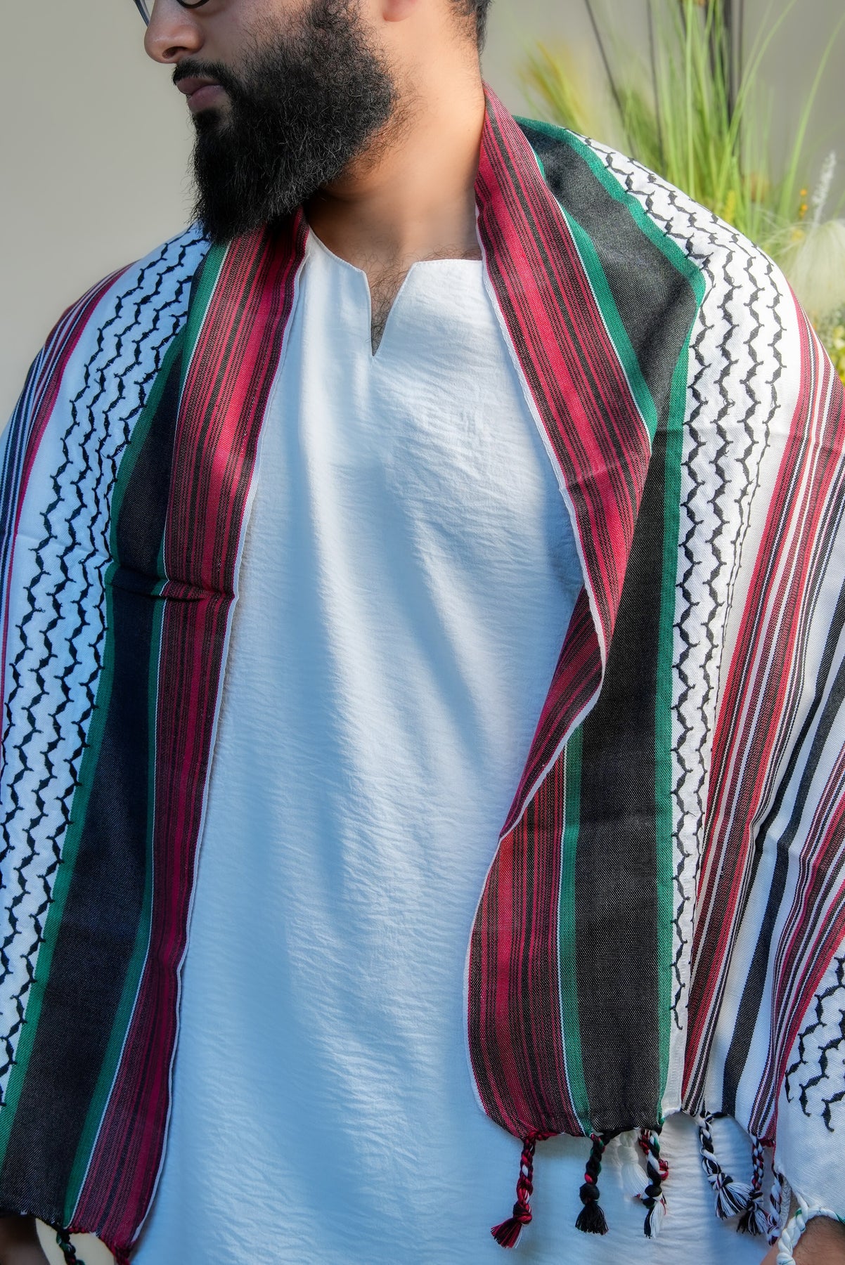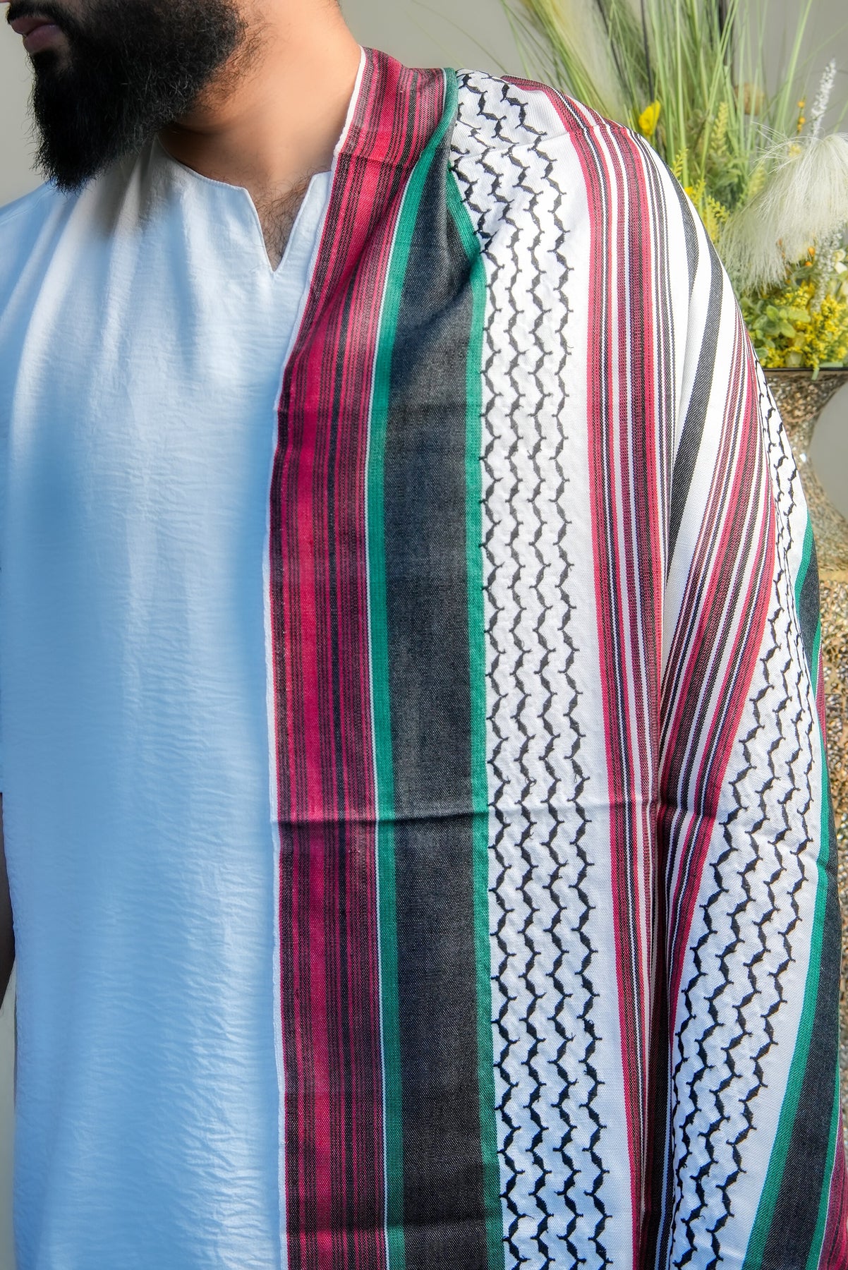 Encircling the design are the colors of the Palestinian flag—red, green, white, and black—woven with care and intention. The softened tones evoke the endurance of Gaza and the enduring dignity of its people. This isn’t a fading; it’s a quiet strength, a subtle resilience born from unwavering hope and the memory of what is sacred.