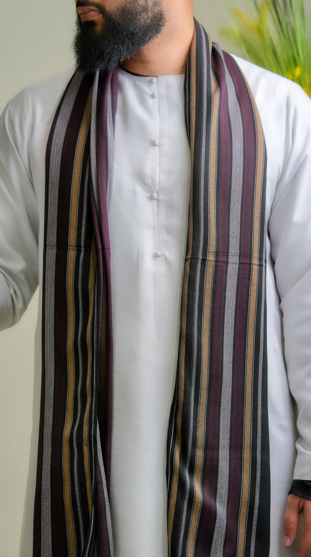 Drawing inspiration from Yemen’s treasured gemstones and the subtle brilliance of its landscapes, 'Aqeeq' Amethyst Ruby is a study in elegance and depth. Its purplish-red base mirrors the rich tones of agate and ruby stones, while delicate lines of light gold trace through the weave like veins of sunlight across polished gems. The interplay of colors creates a dynamic shimmer, evoking movement and vitality while maintaining a sense of refined balance.