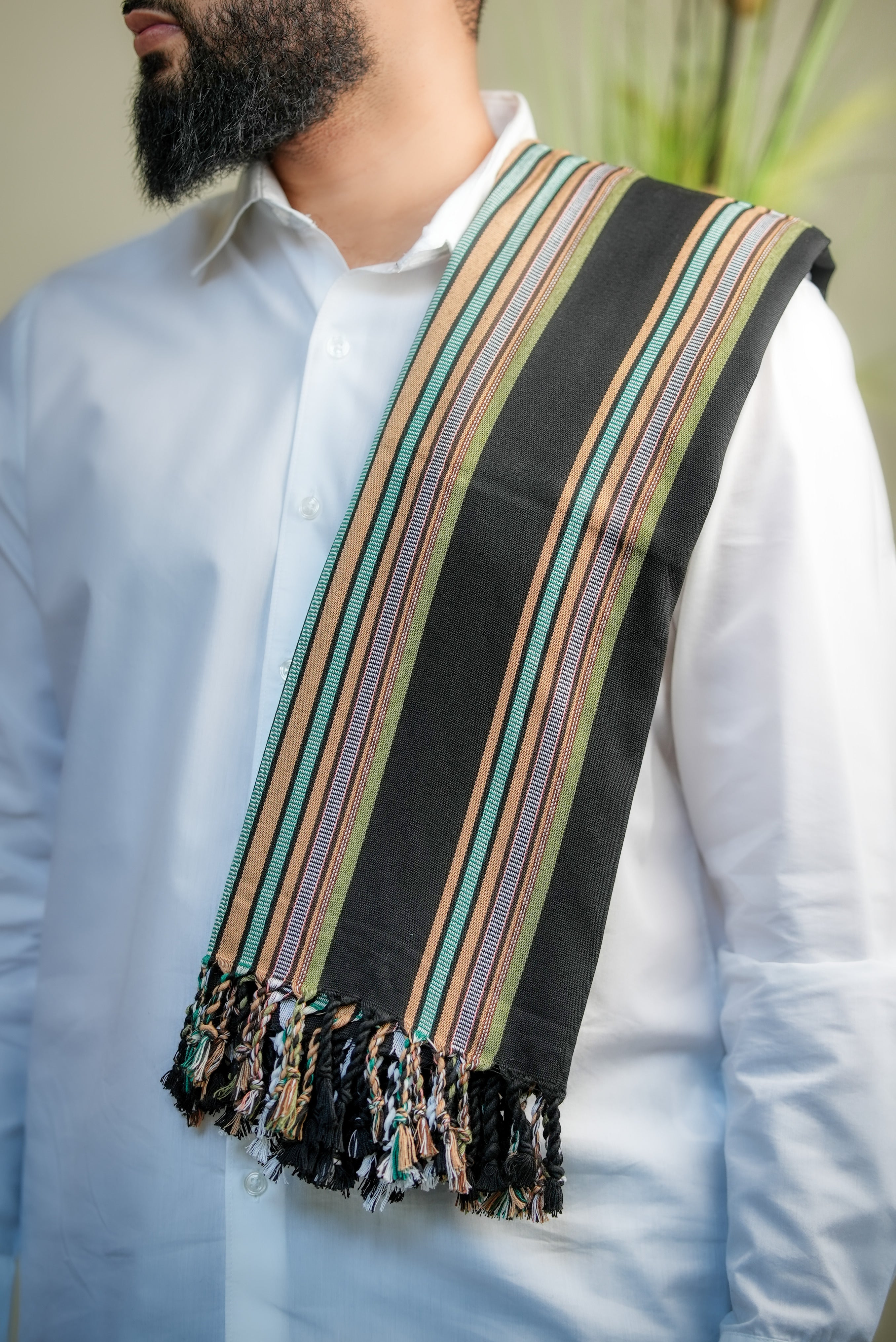 The ‘Bayhan Celestial Brown’ shawl celebrates the harmony between earth and sky, capturing the quiet majesty of Yemen’s terrain under a celestial canopy. Its layered tones and flowing lines create a sense of depth, movement, and timeless elegance, making it more than an accessory — it’s a reflection of nature’s poetic balance.