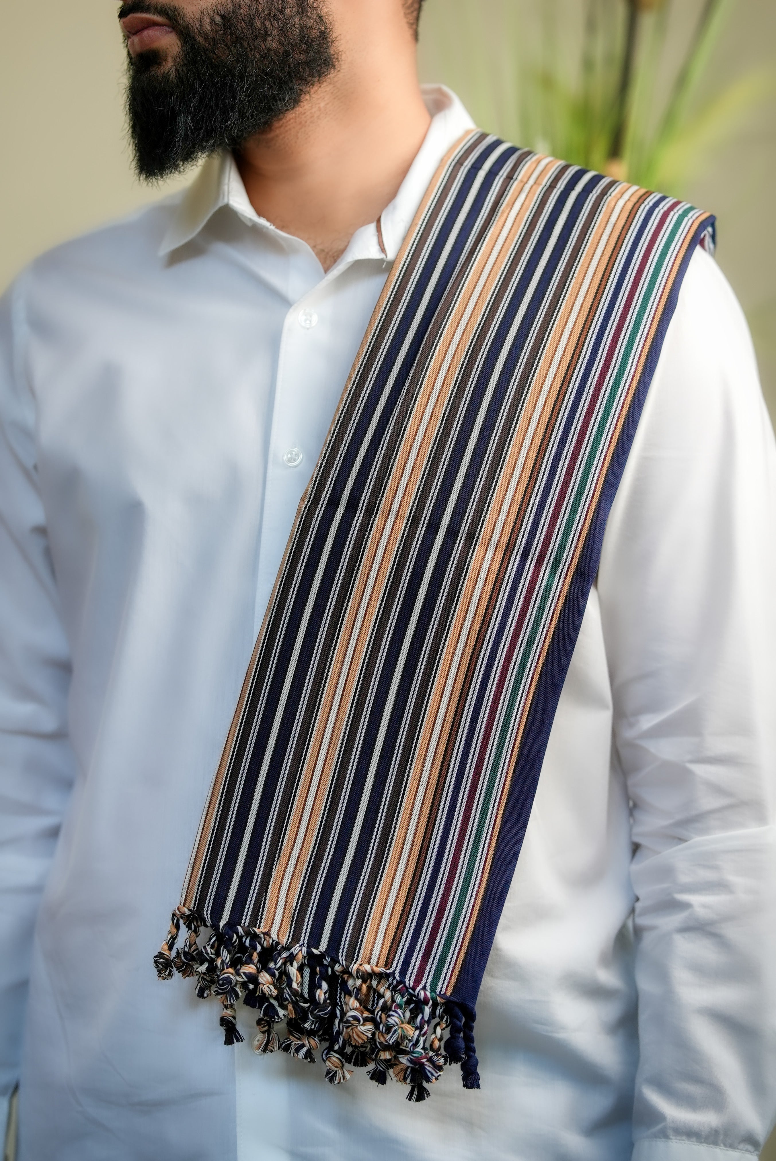 The ‘Socotra Sunset Coral’ shawl embodies intrigue, vitality, and elegance. Tangerine and creamsicle hues reflect the radiant warmth of dusk, while brown and green accents echo the muted vibrancy of unique desert flora. More than an accessory, it celebrates Yemen’s rare natural wonders and timeless artistry. Wearing it is a statement of bold, exotic style and a connection to landscapes both mystical and vibrant.