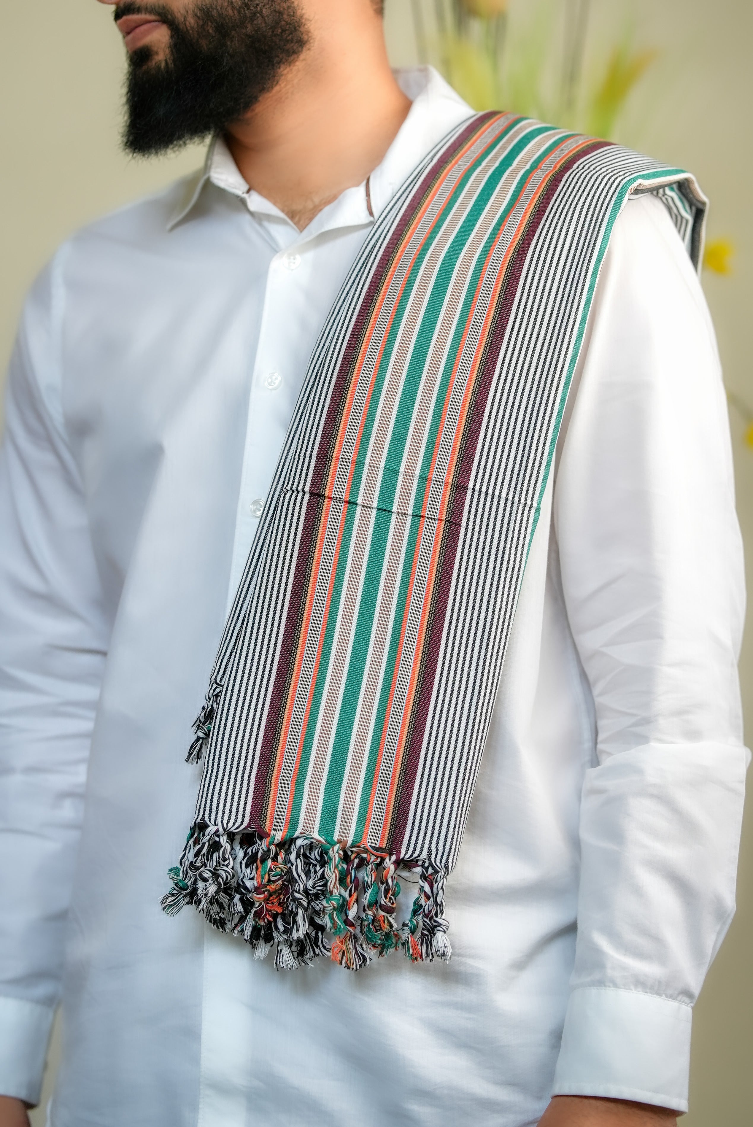Embrace the subtle elegance of Yemen’s mountain landscapes with the ‘Mahwit’ Marble Grey shawl. Inspired by the striking contrast of grey marble veins running through the rugged hills of Al-Mahwit, this shawl features a refined grey base with off-white stripes that evoke the delicate interplay of light and shadow on the stone’s surface. The design reflects the timeless beauty of nature’s textures, creating a piece that is both sophisticated and serene.