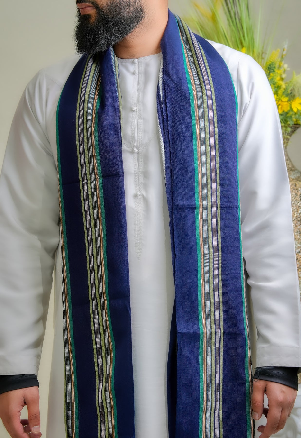 Draped or wrapped, it brings a sense of freshness and clarity—an homage to Yemen’s eastern landscapes, where nature’s softer blues emerge against vast earth tones, and where heritage flows steadily from one generation to the next.
