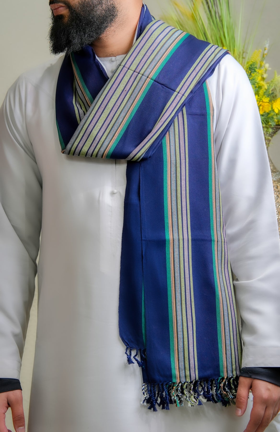 Inspired by the rare desert springs of Al-Mahrah—where clear blue waters surface quietly between sand and stone—this shawl reflects the calm renewal that follows scarcity. Its soft blue tones mirror the gentle pools that gather after seasonal rains, bringing life to the land and offering moments of stillness across the open desert.