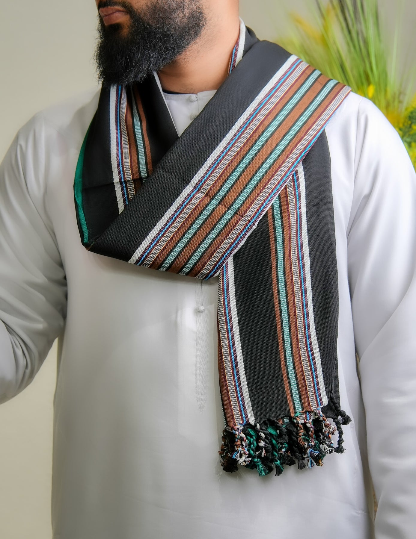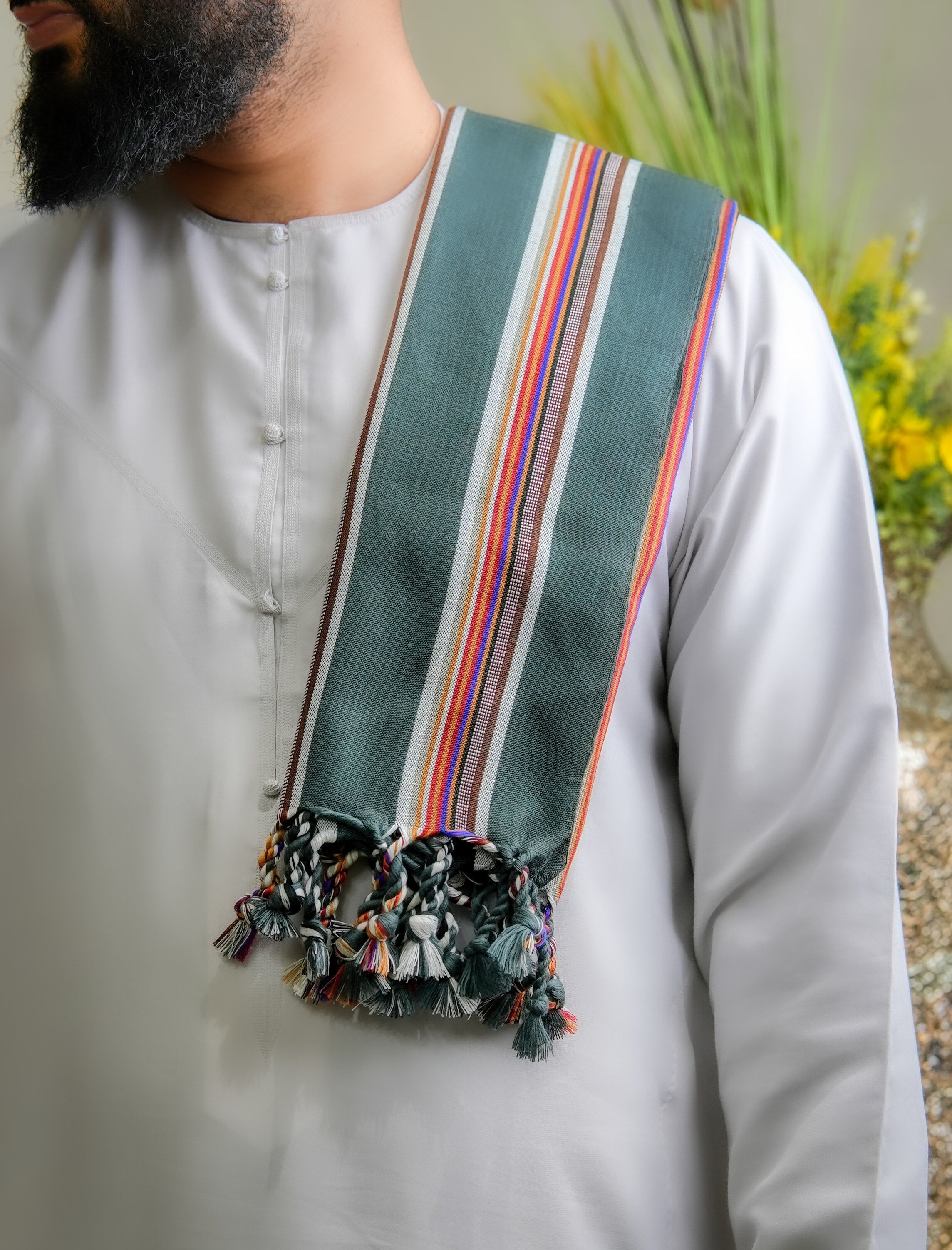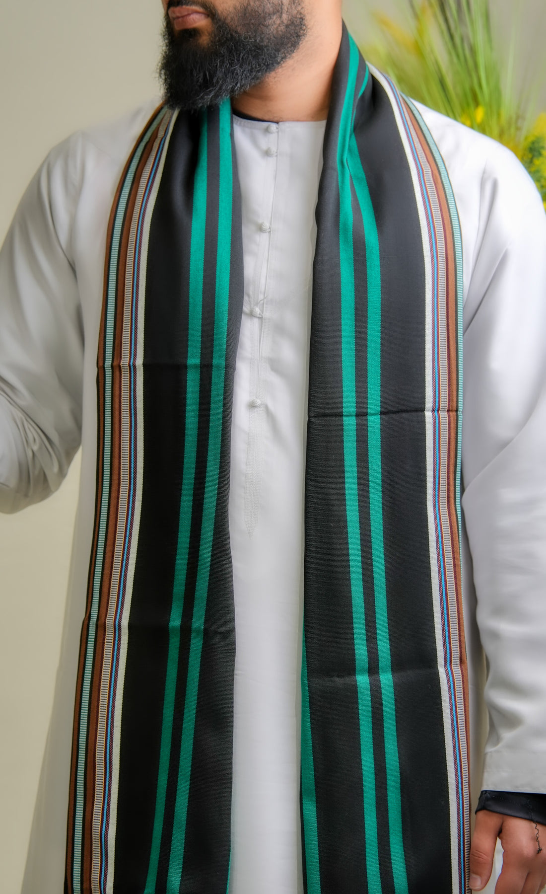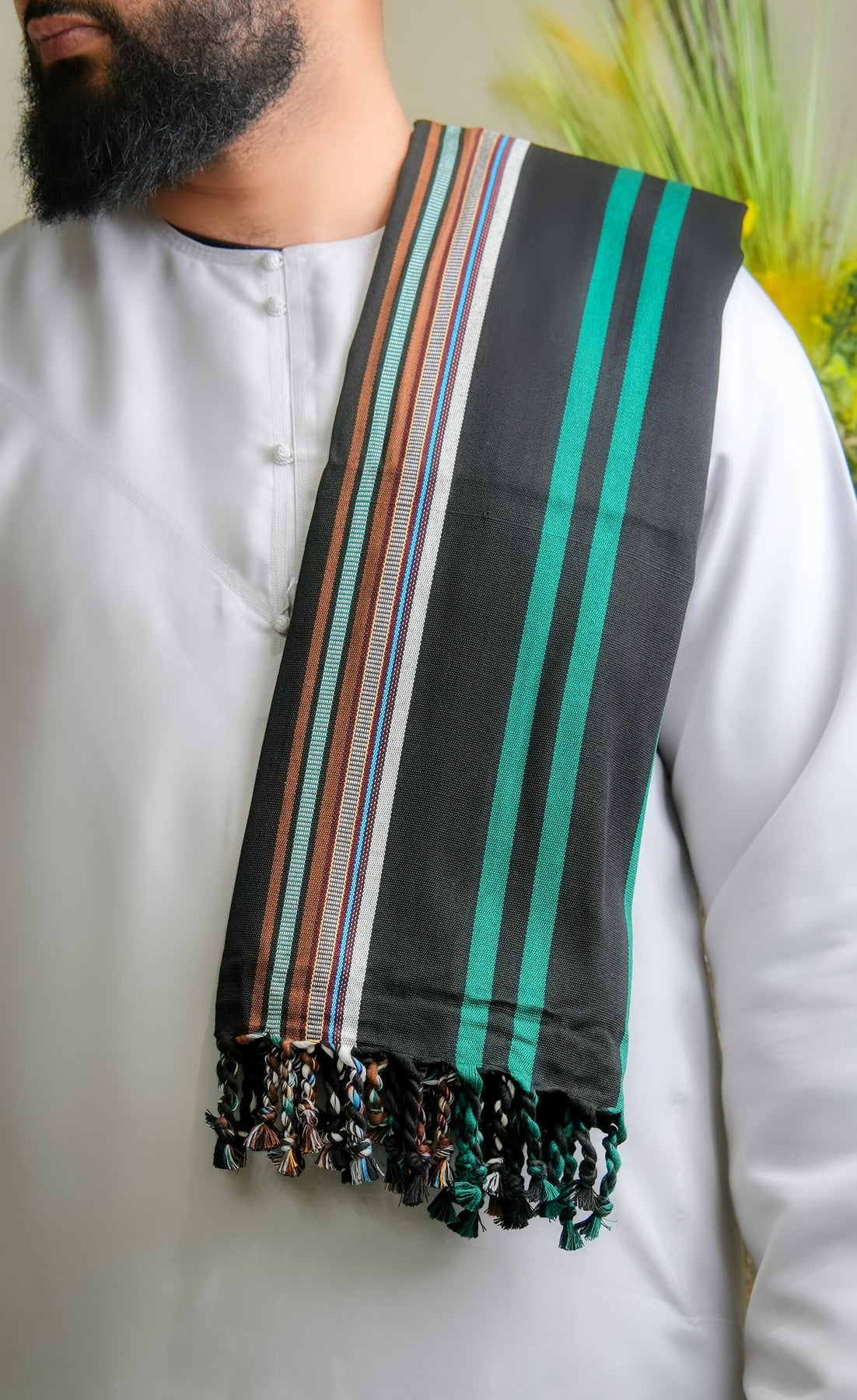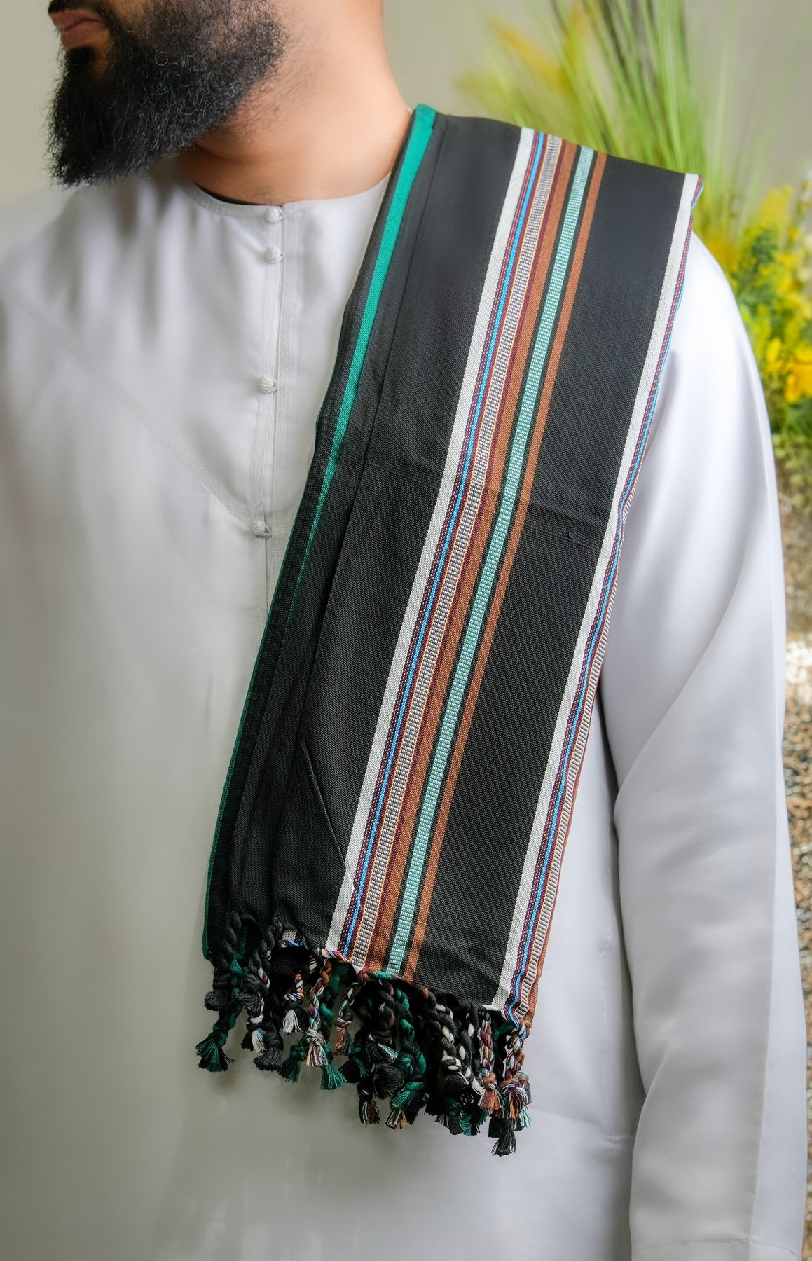 This shawl carries the presence of something both grounded and striking. The black foundation offers timeless versatility, while the green accents bring energy and distinction without overwhelming the piece. Together, they create a balance that feels bold yet composed, rooted in the land yet modern in expression. The weave reflects careful craftsmanship, honoring traditions shaped by patience, precision, and generational skill.