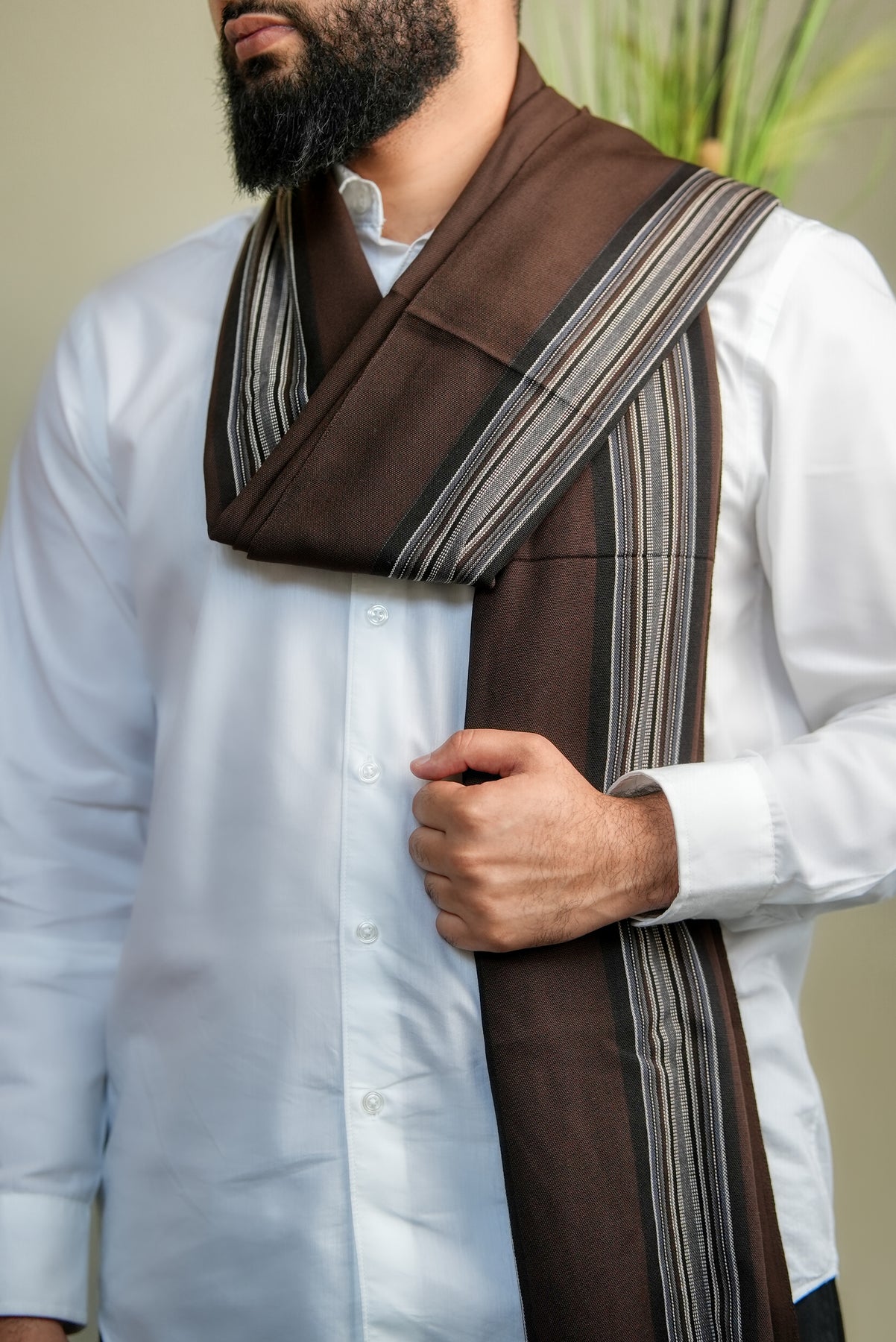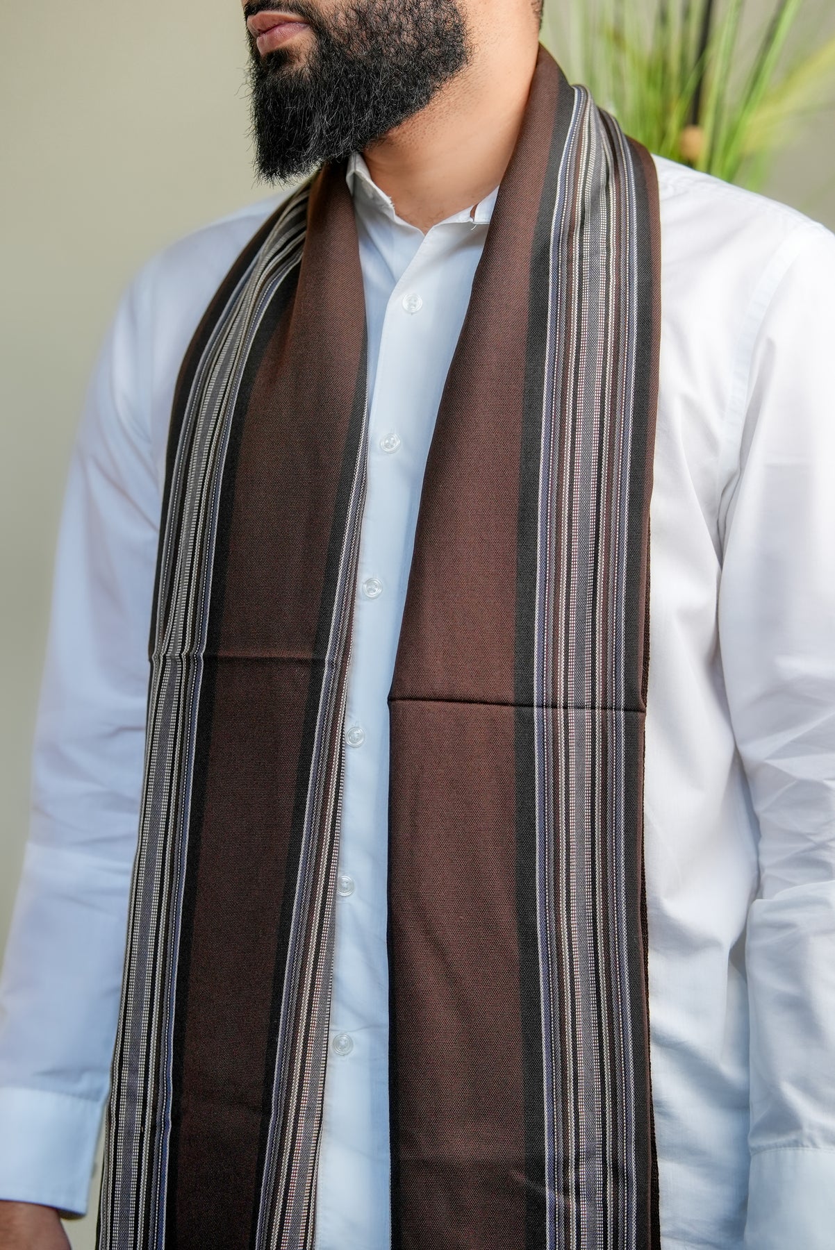 Introducing our ‘Miqran Earth Veil’ shawl, inspired by the rugged highlands of Miqran, where deep brown cliffs are softened by the morning mist. This refined piece features a rich dark brown base, accented with subtle light grey lines, evoking the harmony of stone and sky in Yemen’s mountainous landscapes. The interplay of dark and light reflects the understated beauty and strength of nature.