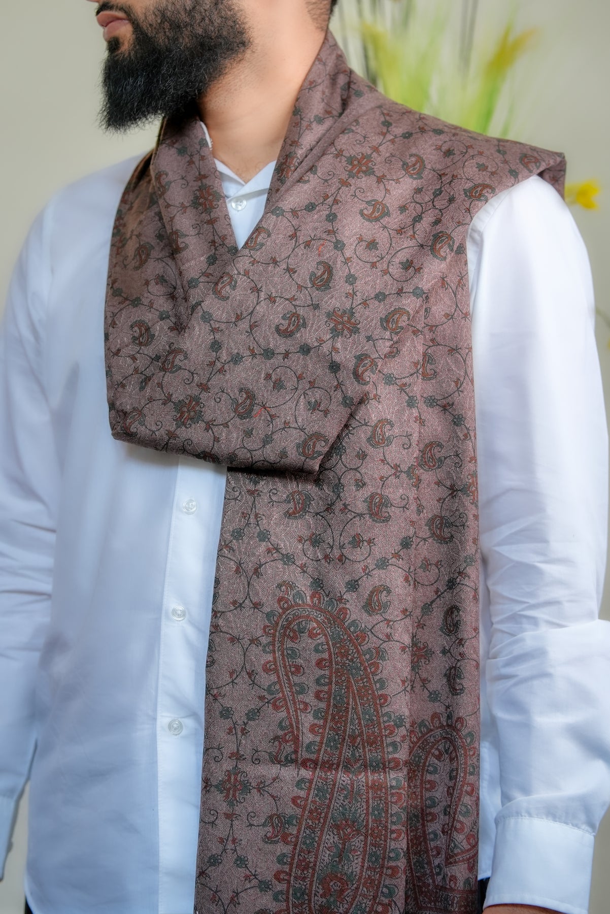 Introducing our ‘Zahara Garden Vine’ shawls, inspired by an imagined, flourishing garden where blossoms and vines weave in endless harmony. Its base is a soft, luminous ivory, evoking the gentle light of morning across dew-kissed petals. Flowing vines stretch gracefully across the fabric, carrying flowers in warm and inviting tones — from blush and coral to soft amber and green — creating a sense of connectedness and vitality throughout the design.