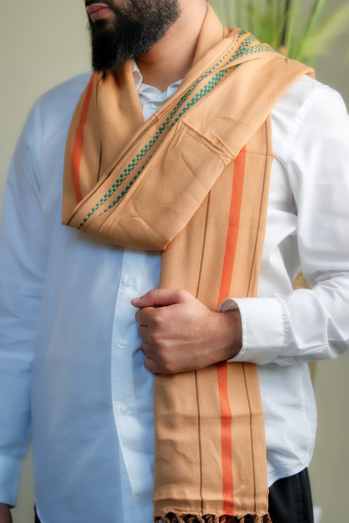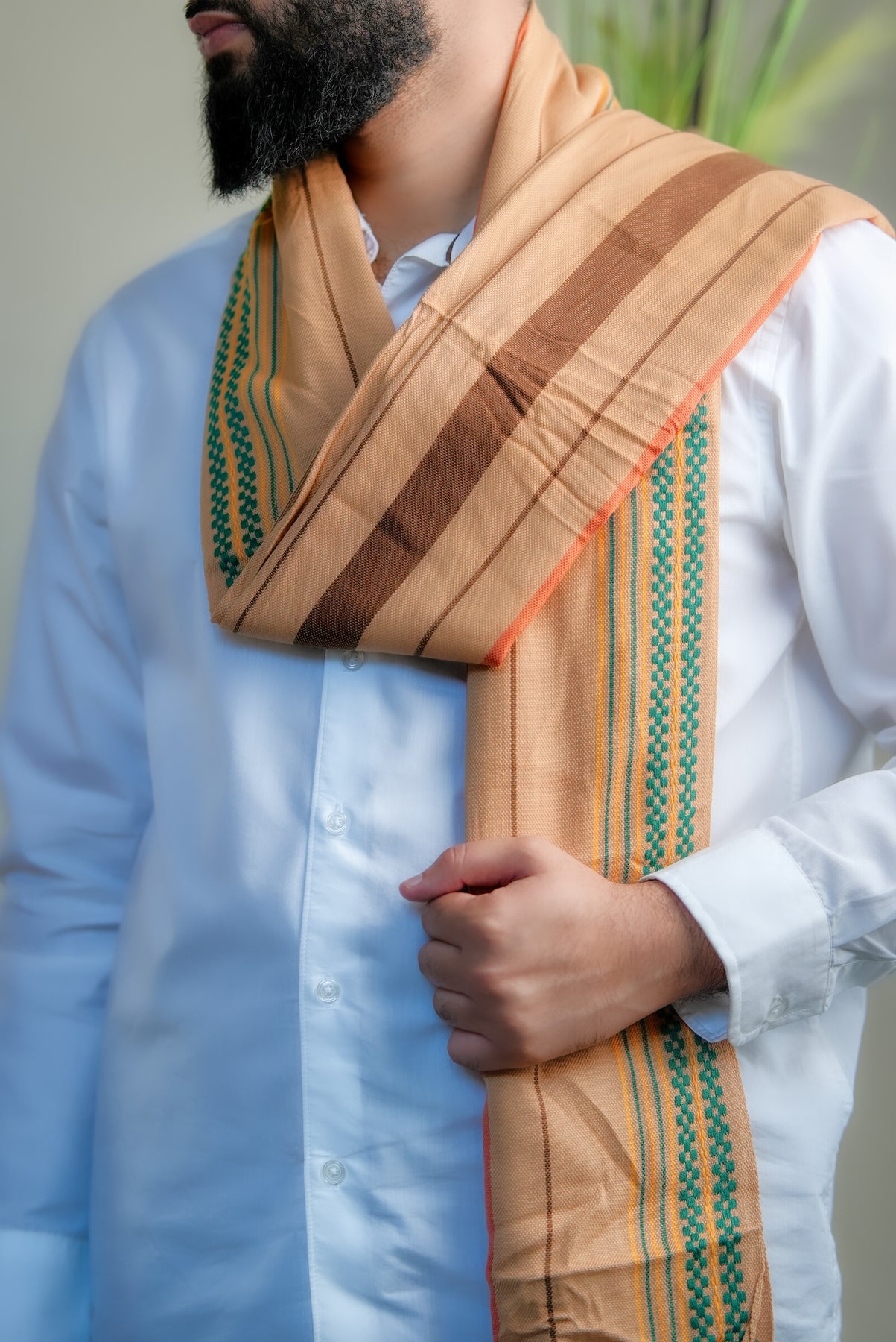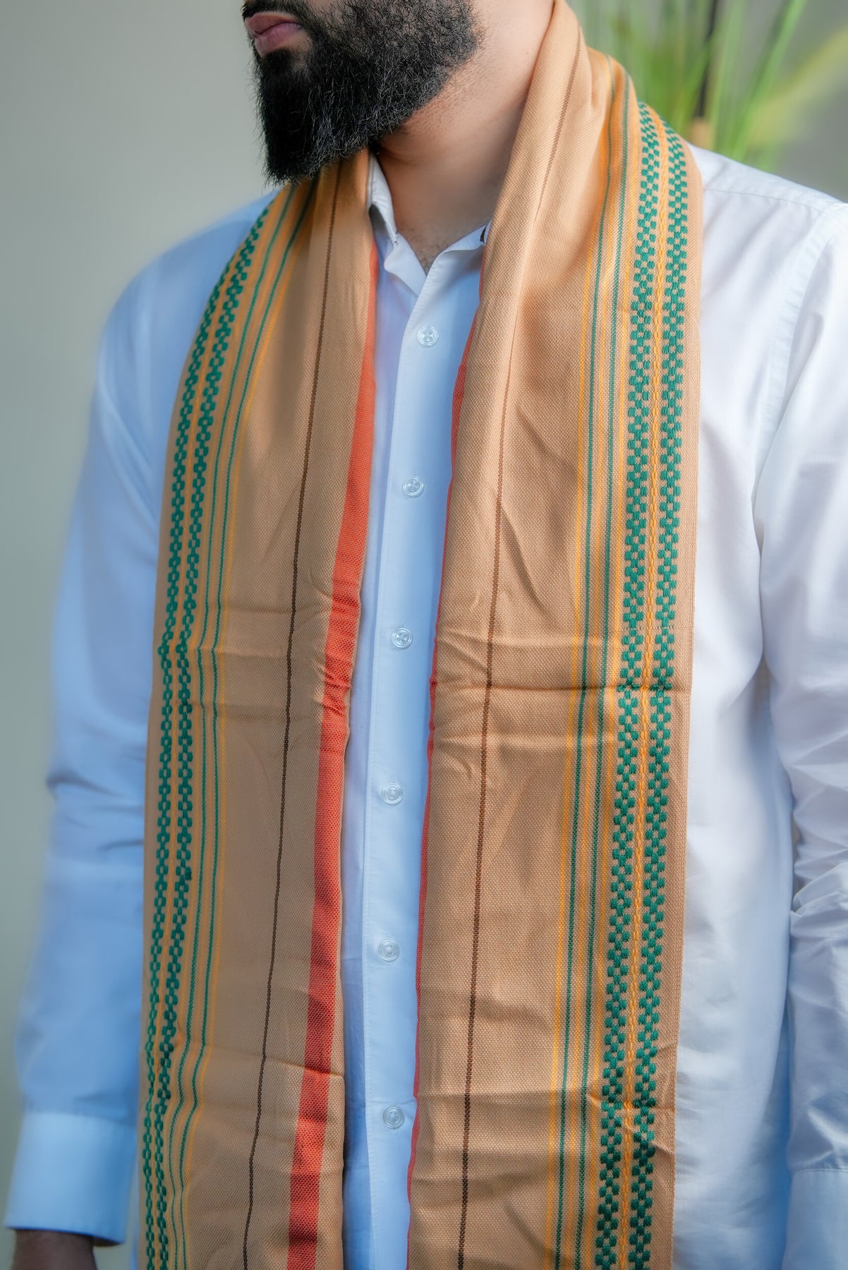 Introducing our ‘Sa’dah Golden Grove’ shawl, inspired by the sunlit orchards of Sa’dah, where golden fields meet flourishing groves of pomegranates and citrus. Its base is a radiant gold, glowing like warm afternoon light, while streaks of verdant green and vibrant orange flow across it, echoing the vitality of fruit-laden trees swaying in the breeze.