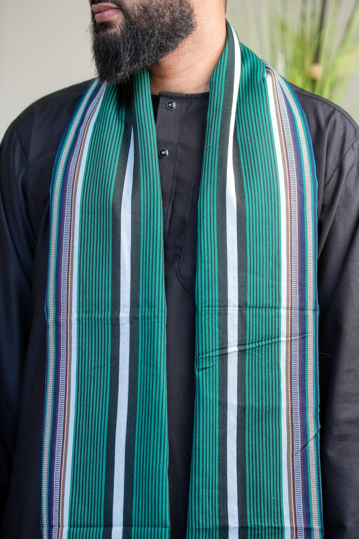 Introducing our ‘Ibb Terrace Stripe’ shawl, inspired by the lush terraced hillsides of Ibb, Yemen’s verdant province where fertile greenery meets drifting mountain mist. Its base alternates between crisp white and fresh green stripes, evoking the layered fields that step gracefully down the highland slopes.