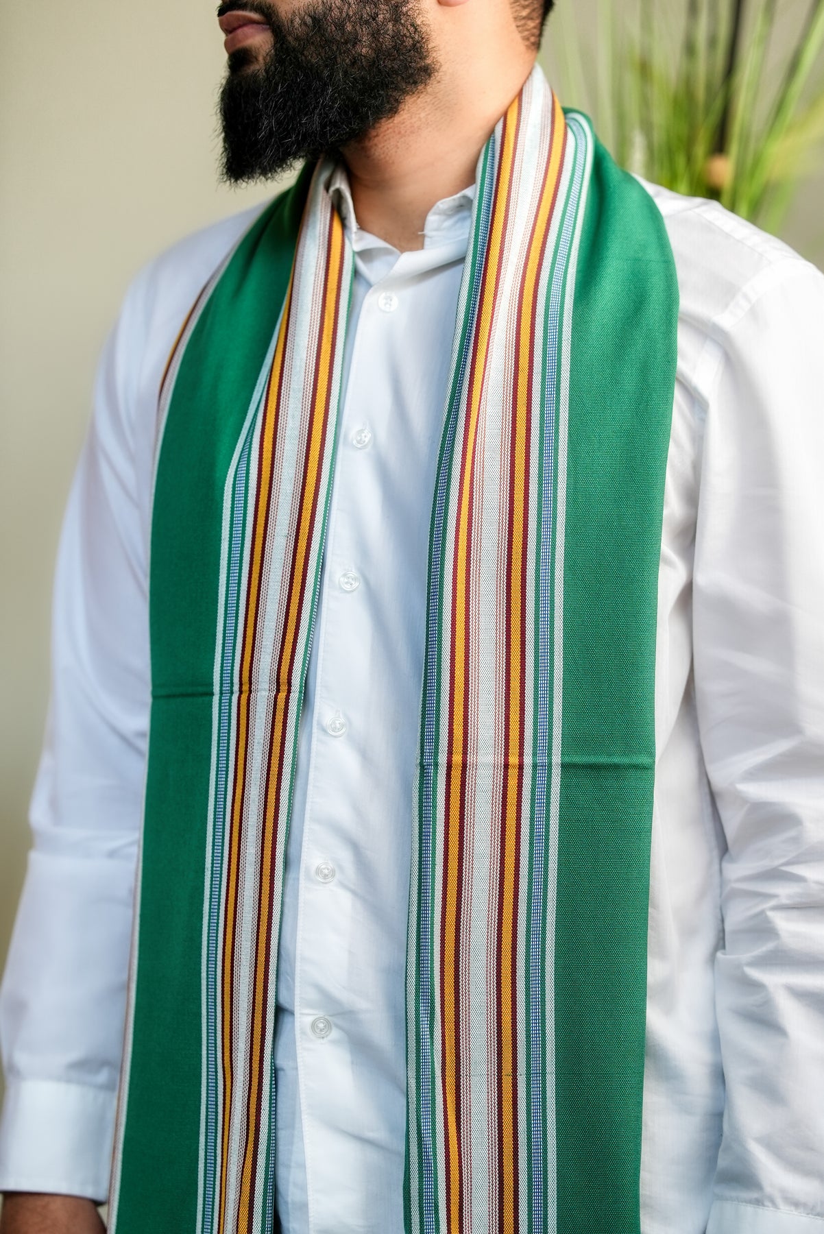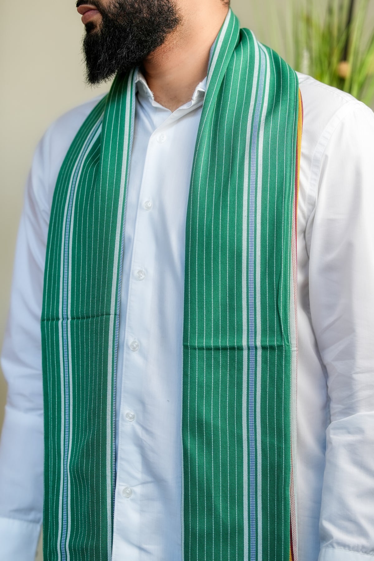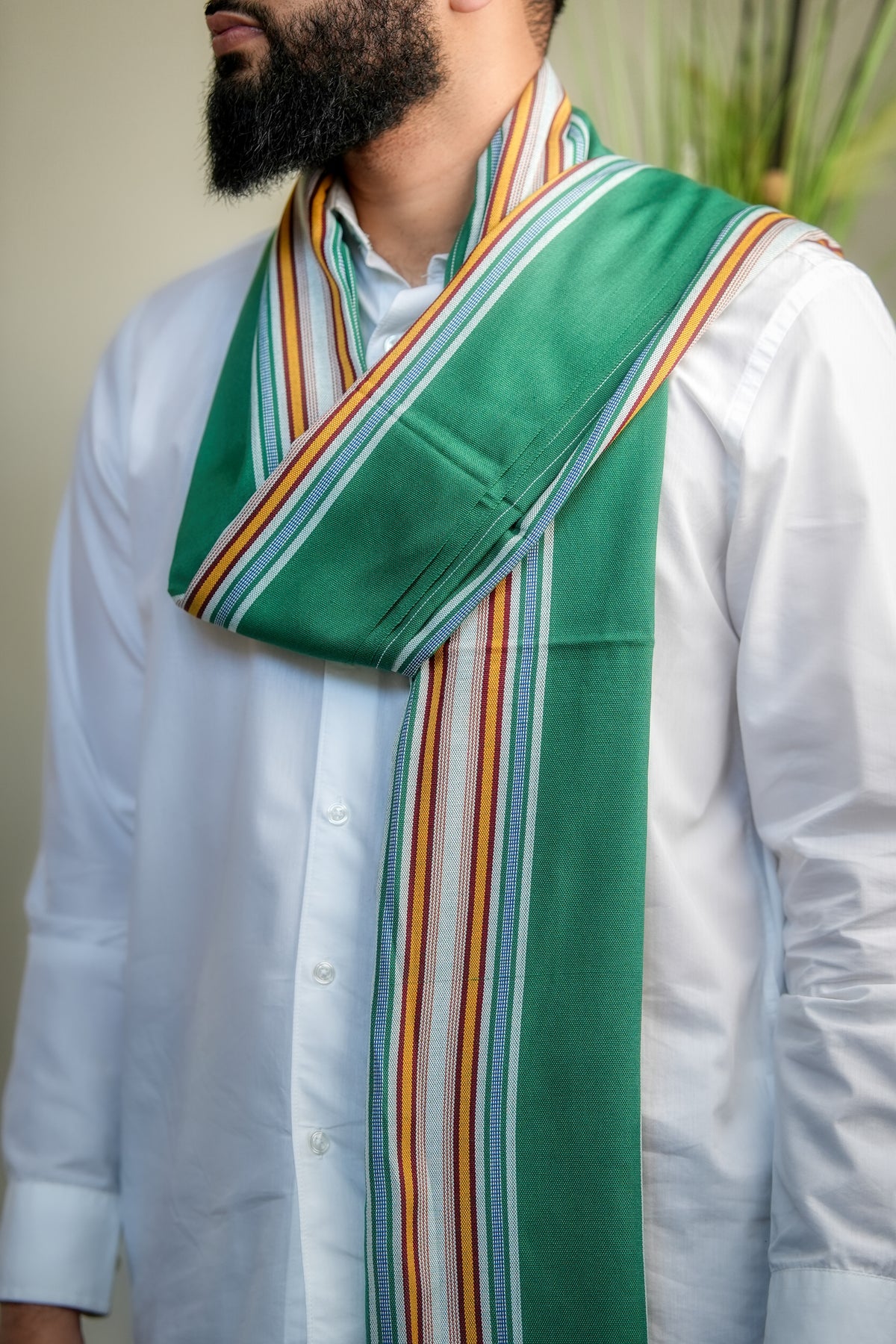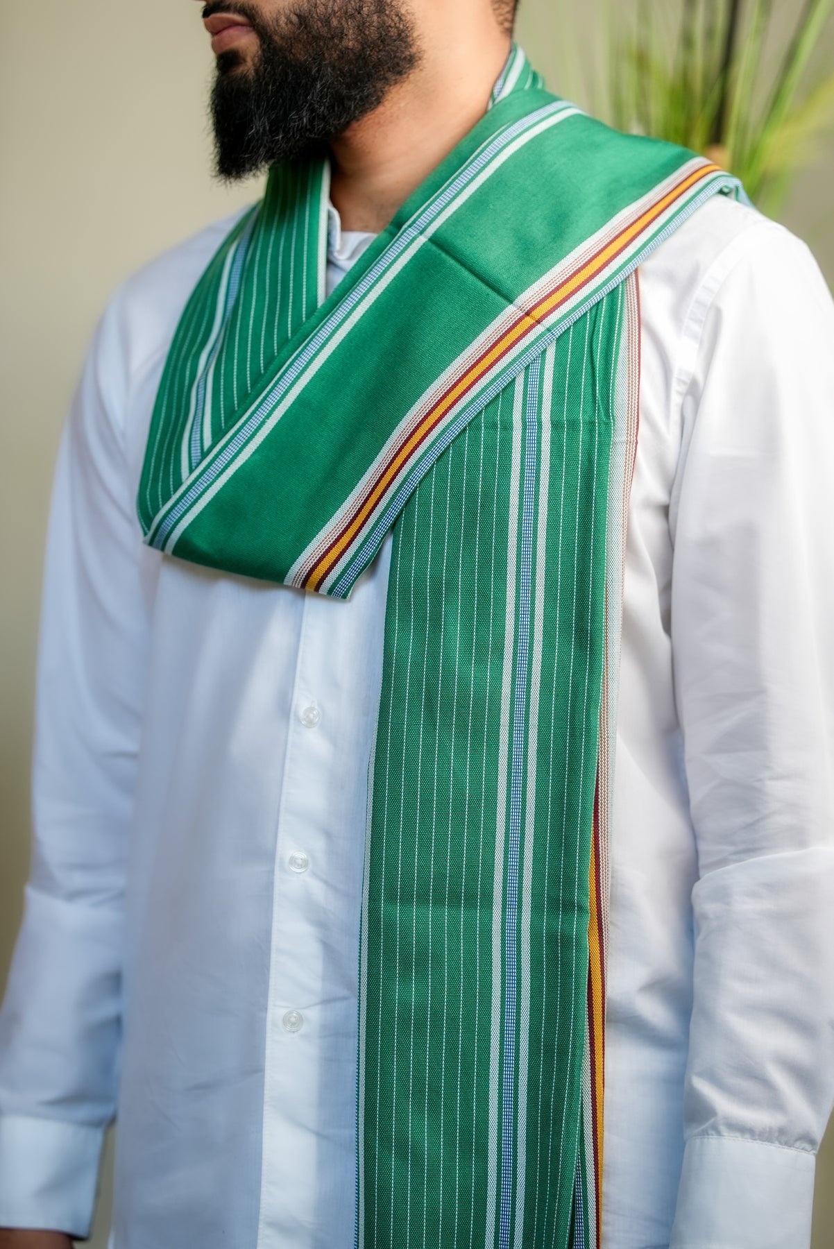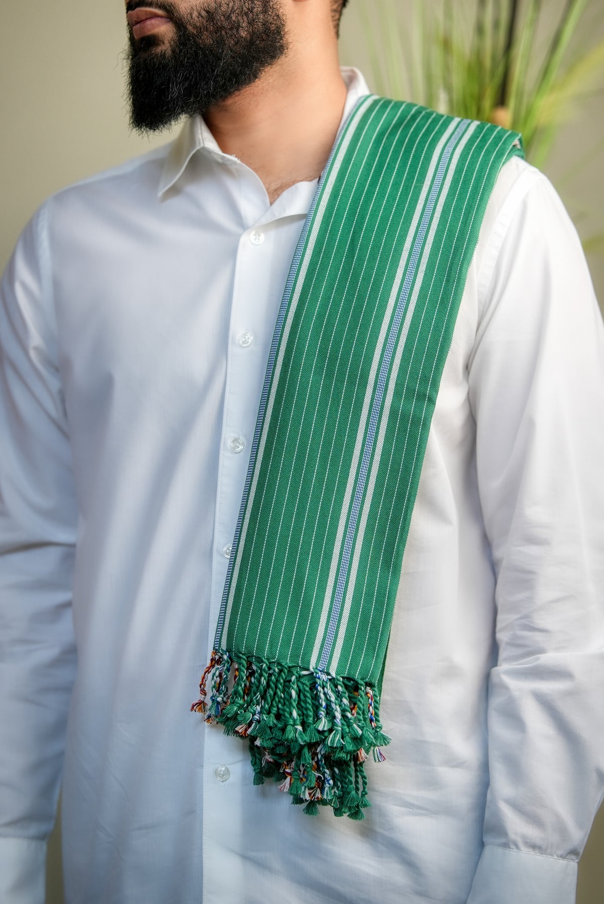 Introducing our ‘Jabal Grove Green’ shawl, inspired by the lush hills of Yemen where vibrant citrus groves cascade across mountain slopes. Its base is a rich, verdant green, evoking the vitality of leaves and fertile earth, while streaks of crisp white and warm orange flow across like sunlight dancing on ripening fruit.