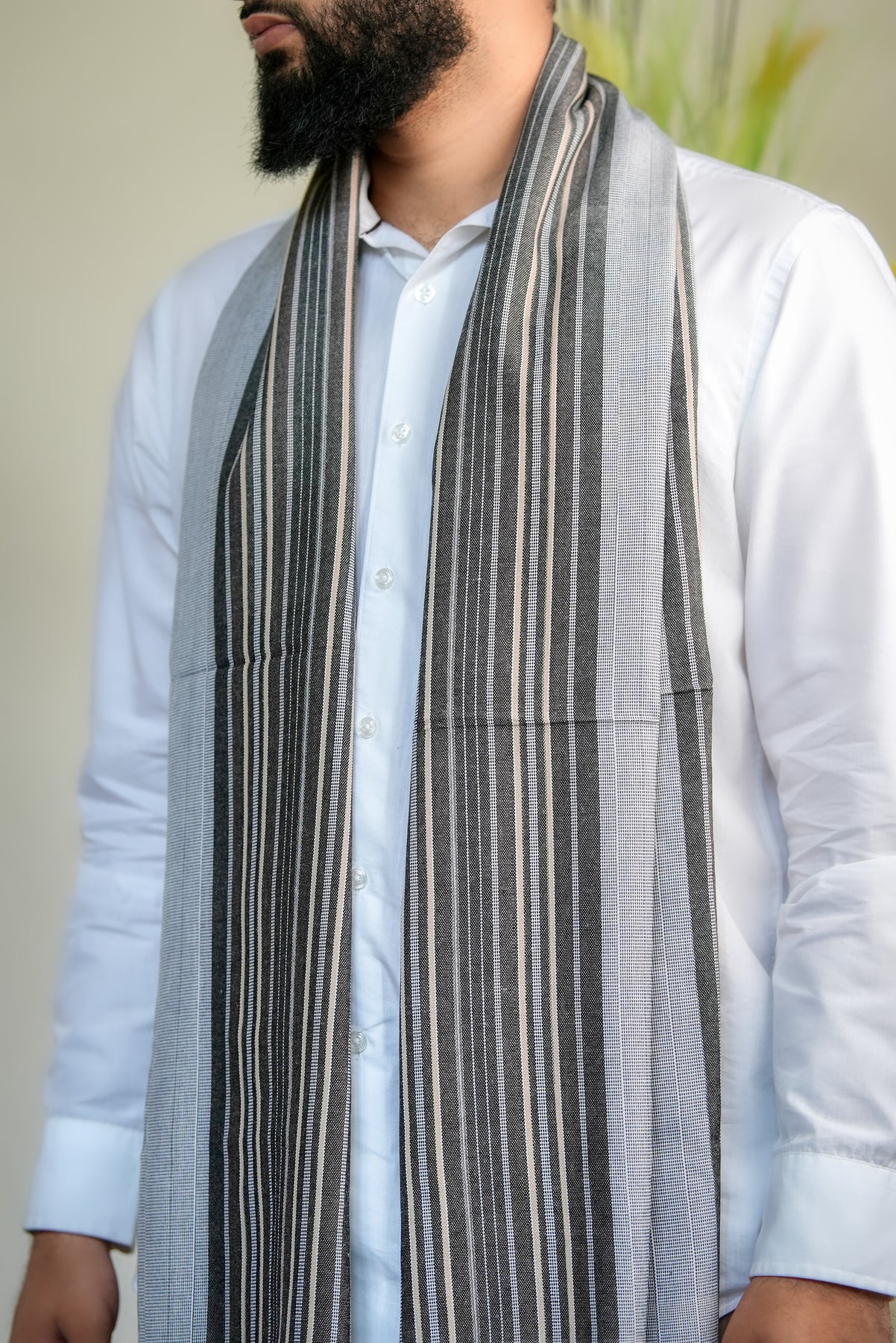 Embrace the subtle elegance of Yemen’s mountain landscapes with the ‘Mahwit’ Marble Grey shawl. Inspired by the striking contrast of grey marble veins running through the rugged hills of Al-Mahwit, this shawl features a refined grey base with off-white stripes that evoke the delicate interplay of light and shadow on the stone’s surface. The design reflects the timeless beauty of nature’s textures, creating a piece that is both sophisticated and serene.