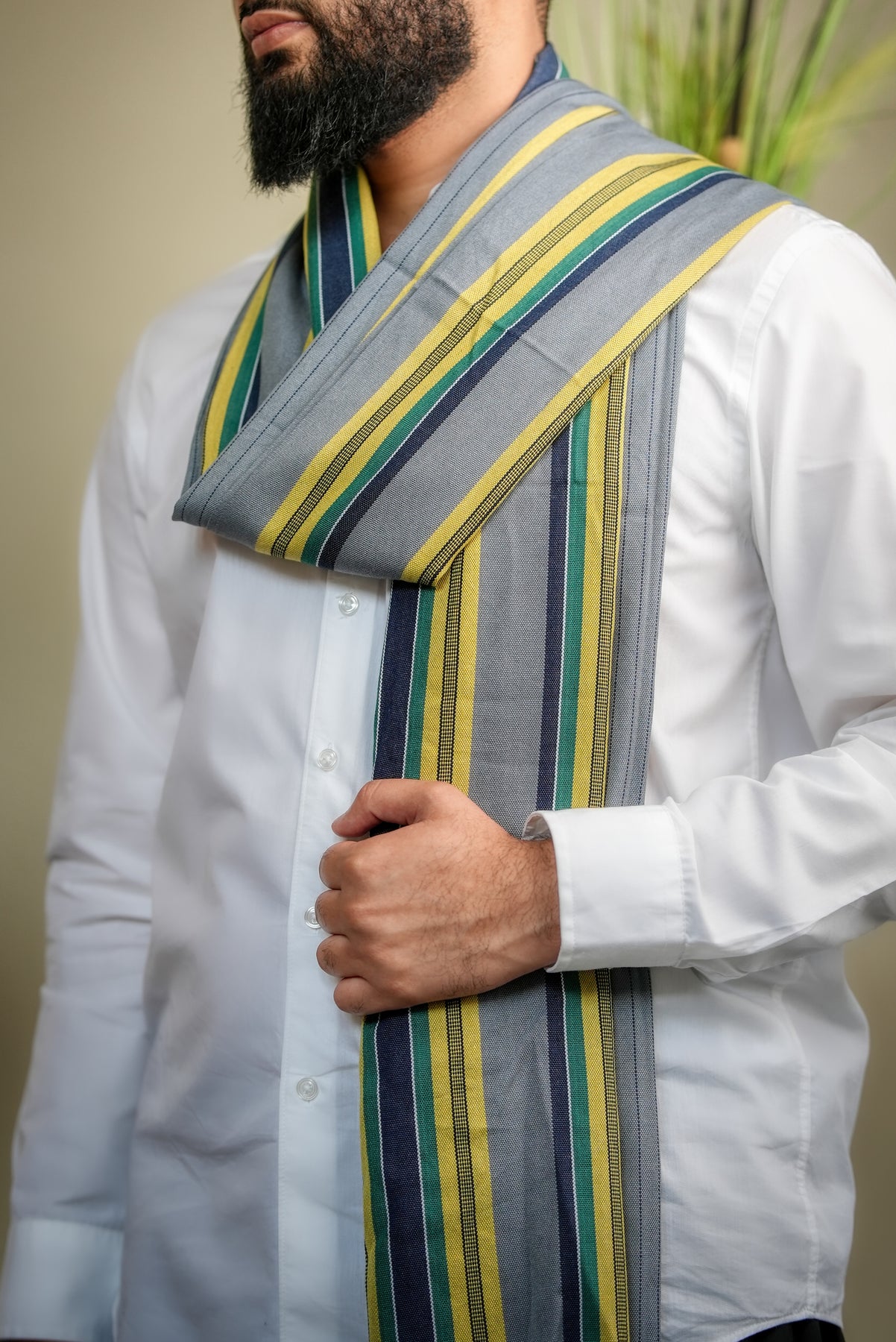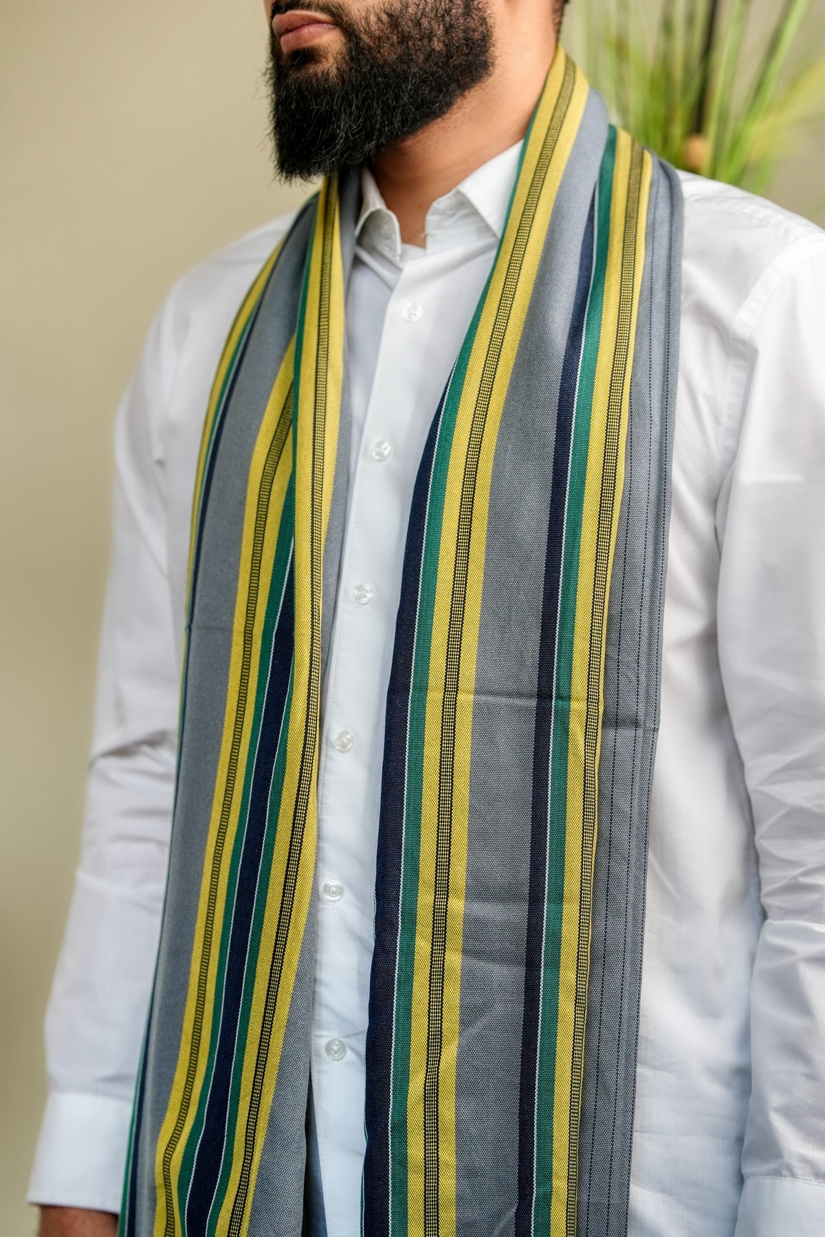 Introducing our ‘Ibb Horizon Grey’ shawl, inspired by the sweeping highland skies of Ibb, where clouds stretch endlessly over fertile valleys. Its base is a soft, grounding grey, like distant mist rolling across the hills, while vibrant streaks of yellow and blue break through with the energy of sunlight and open skies.