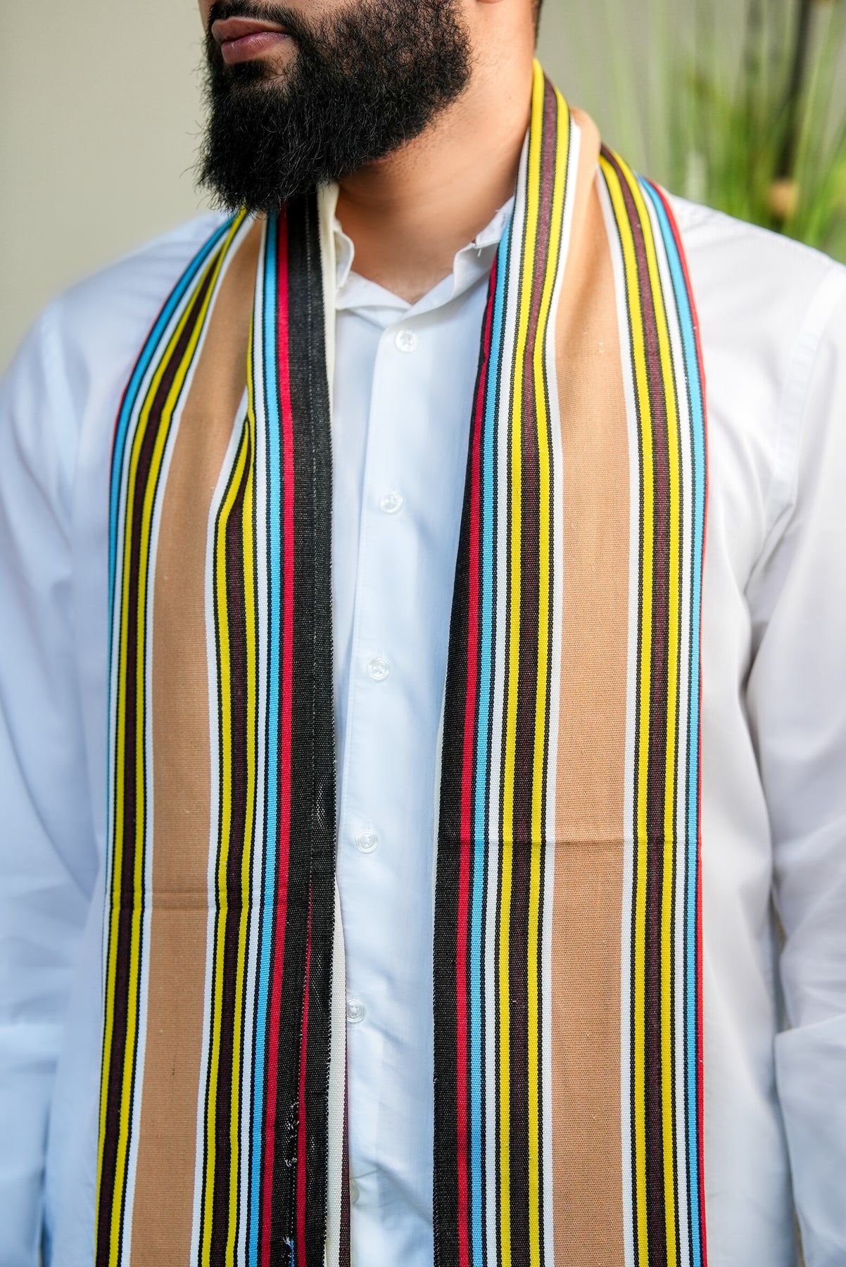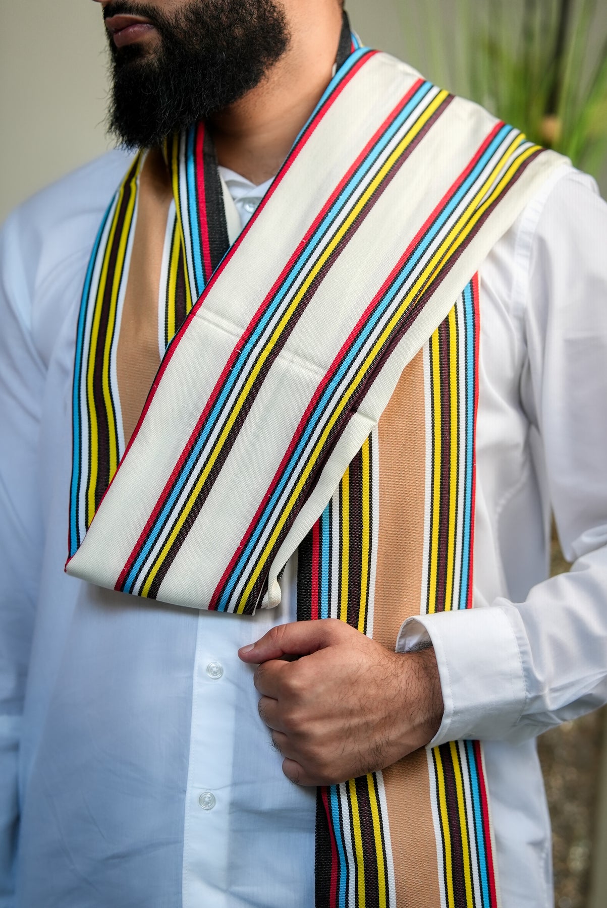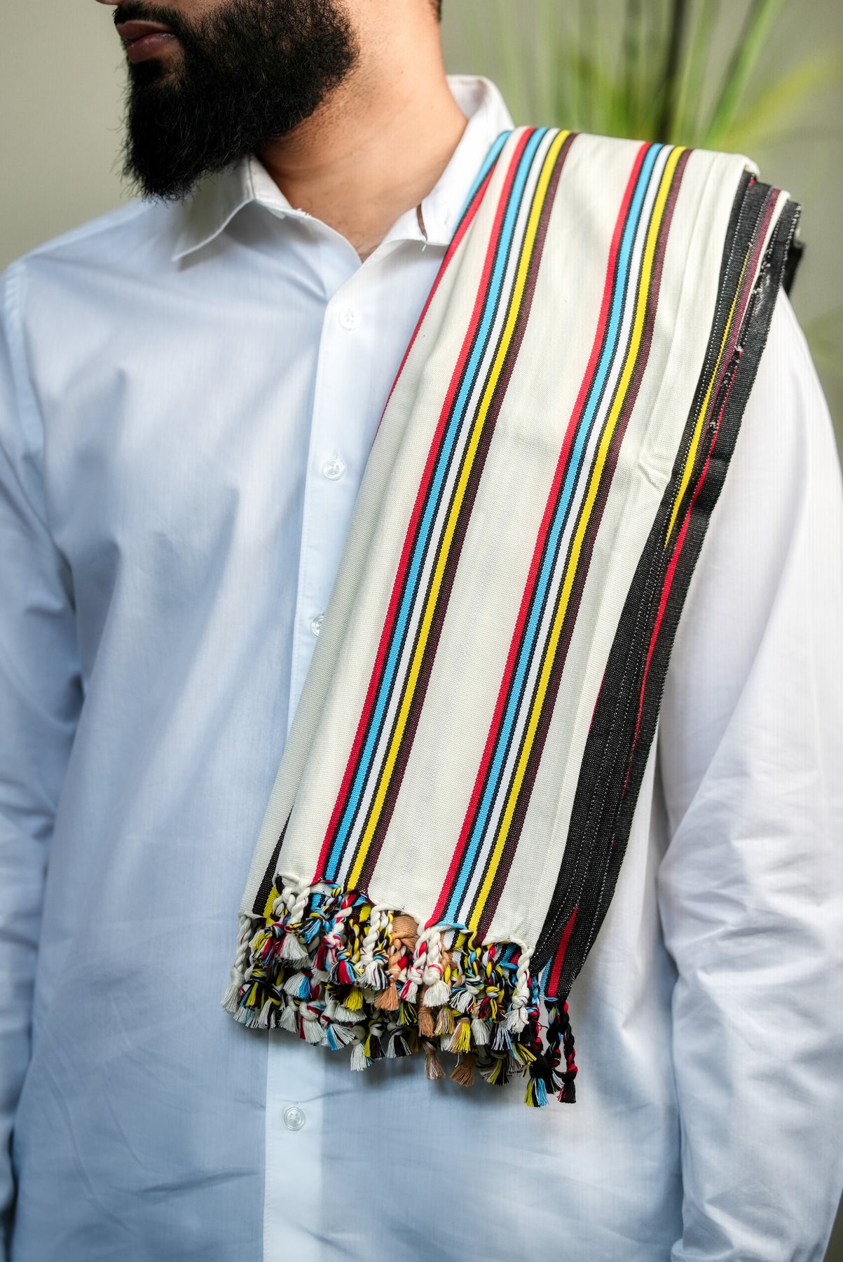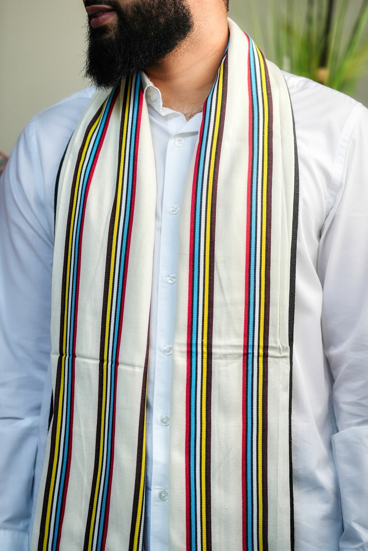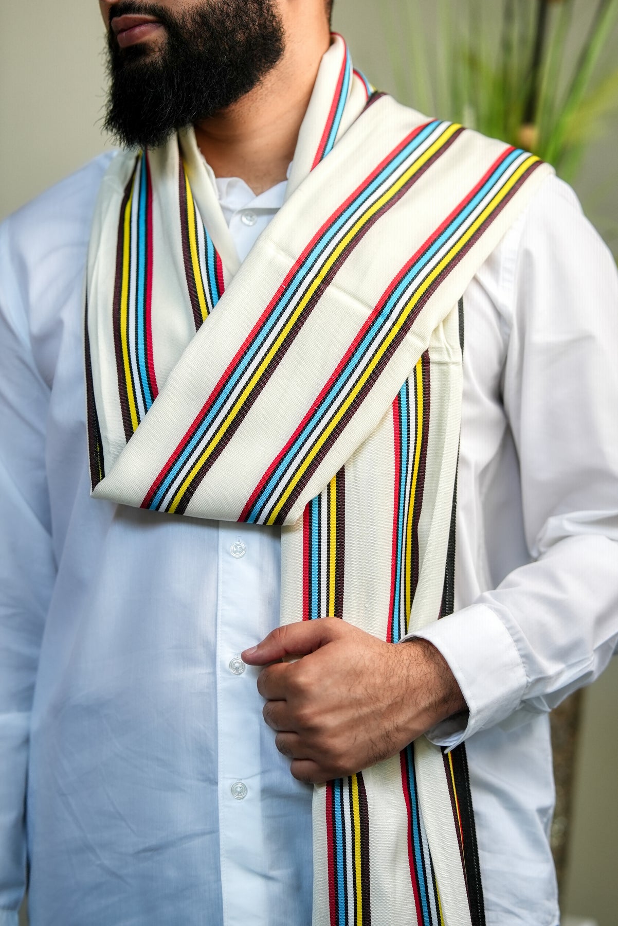 Introducing our ‘Socotra' Exotic Reef shawl, inspired by the dazzling marine life that surrounds the island of Socotra, where vibrant reefs flourish beneath crystal waters. Its base is a pure, luminous white, echoing the clarity of sunlit shores, while flowing streaks of blue, yellow, and red shimmer across the surface like schools of tropical fish weaving through coral gardens.
