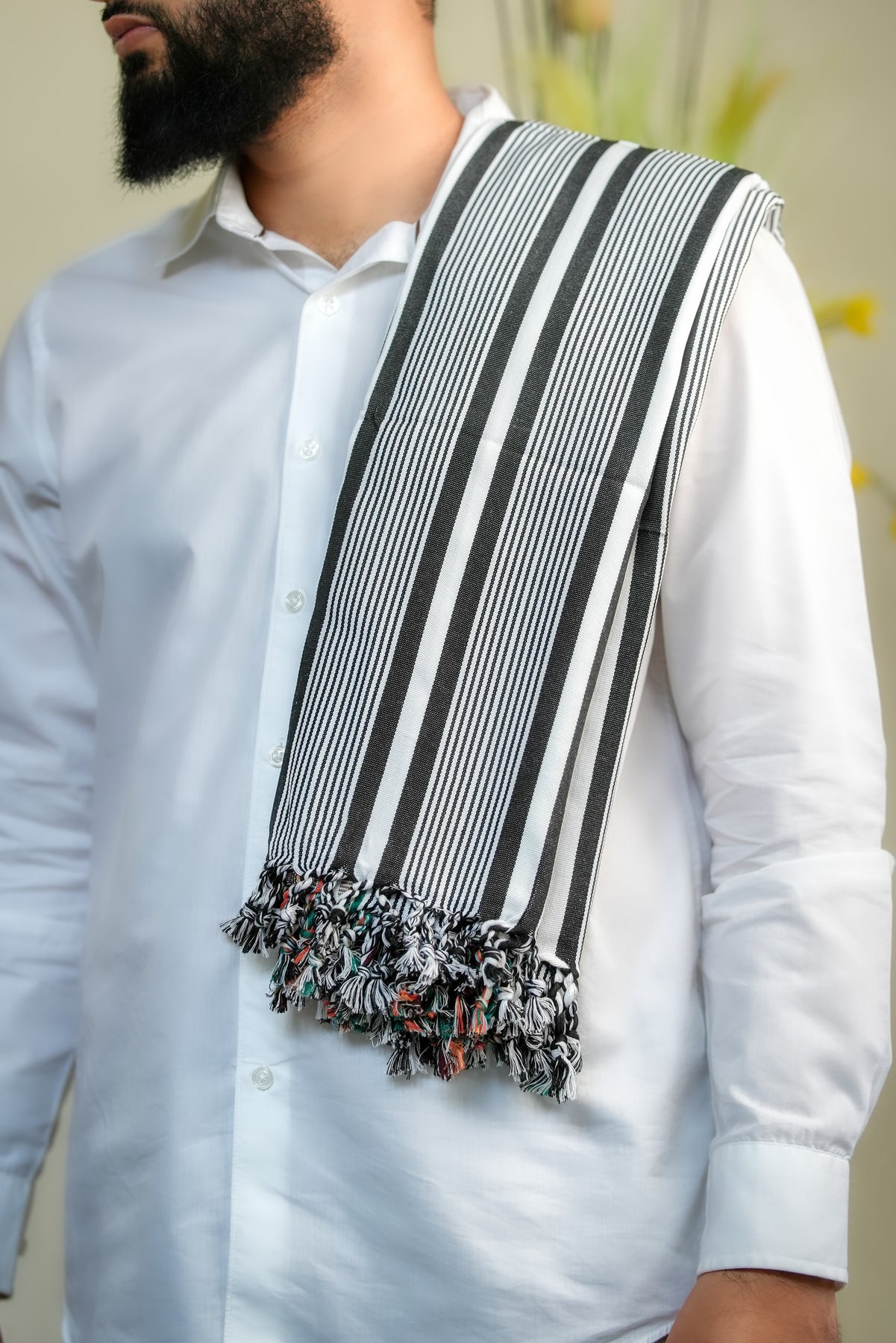 Introducing our ‘Sarraj Zebra Stripe’ shawl, inspired by the bold beauty of nature’s contrasts and the elegance of Yemen’s rugged desert landscapes. This striking piece features dynamic black and white stripes, reminiscent of the timeless patterns found in desert wildlife like the Arabian oryx. The interplay of dark and light evokes the dramatic beauty of the Yemeni desert, where nature’s stark contrasts create a mesmerizing visual impact.