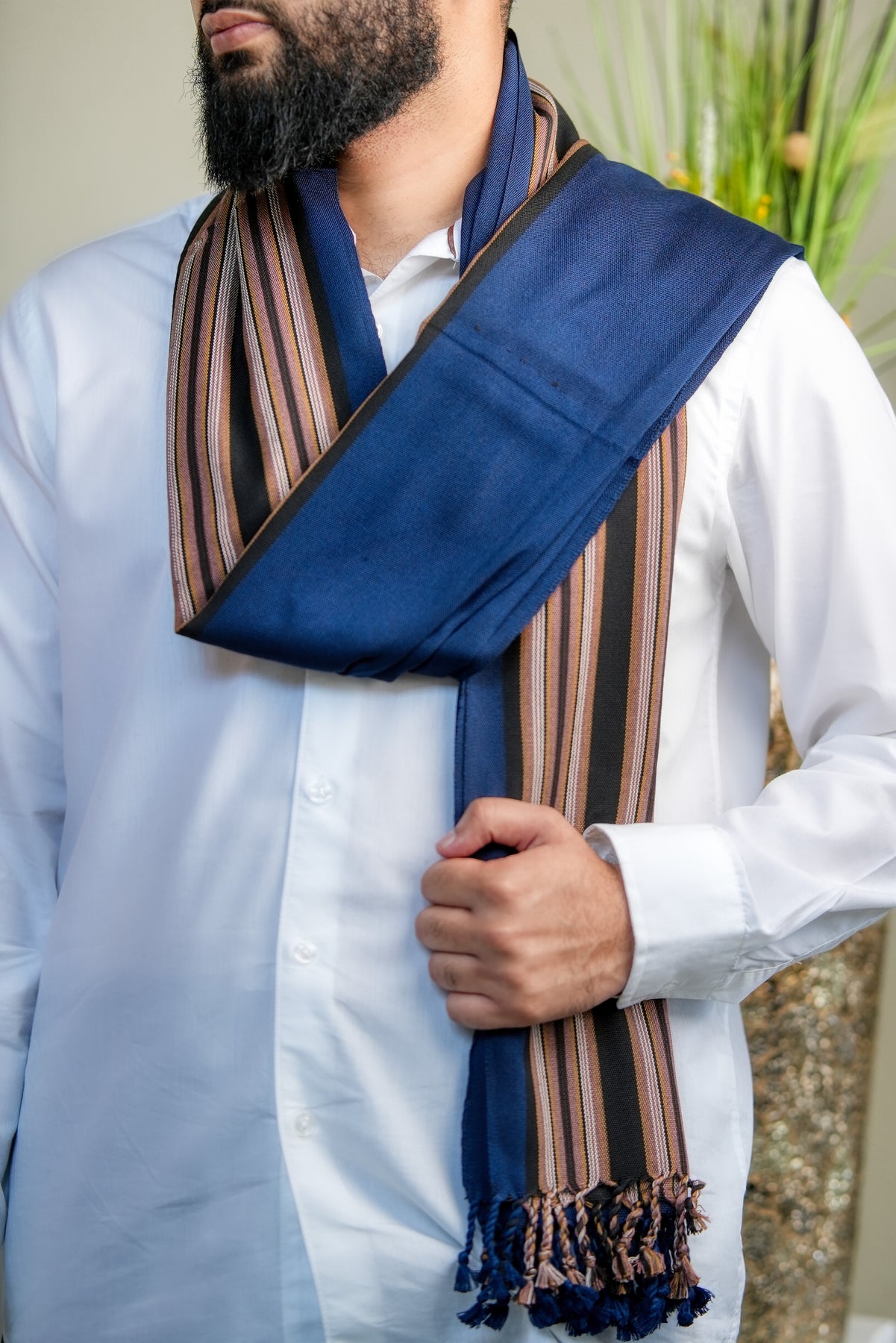 Introducing our ‘Tihama Eclipse Blue’ shawl, inspired by the quiet majesty of the Tihama lowlands at night, where deep blue skies meet the rugged, earthy terrain. Its base is a pitch-dark, oceanic blue, evoking the depth of night, while subtle brown lines flow across like desert ridges and dunes emerging under moonlight.